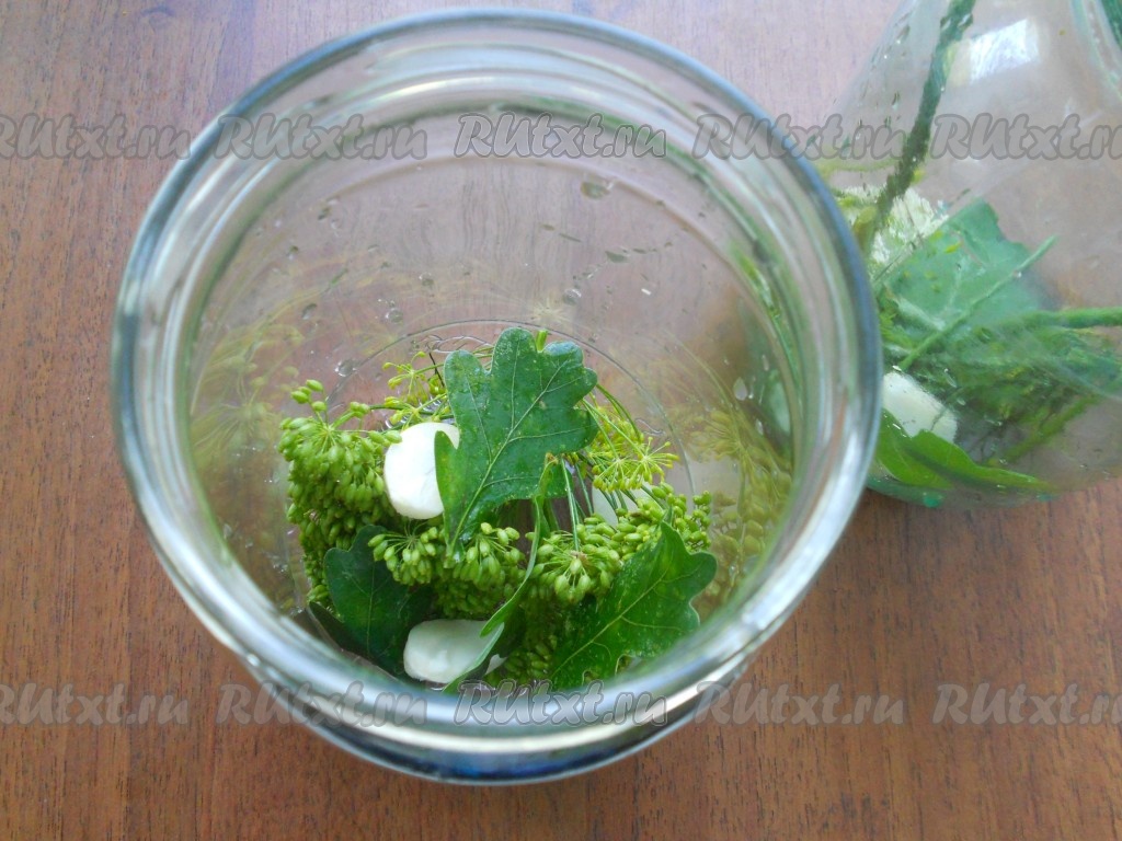 На дно чисто вымытых банок поместить по зонтику укропа, чеснок, листья дуба.