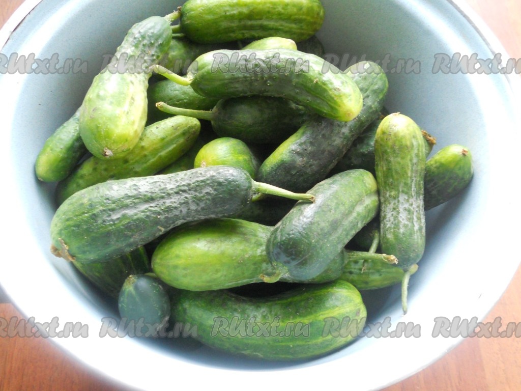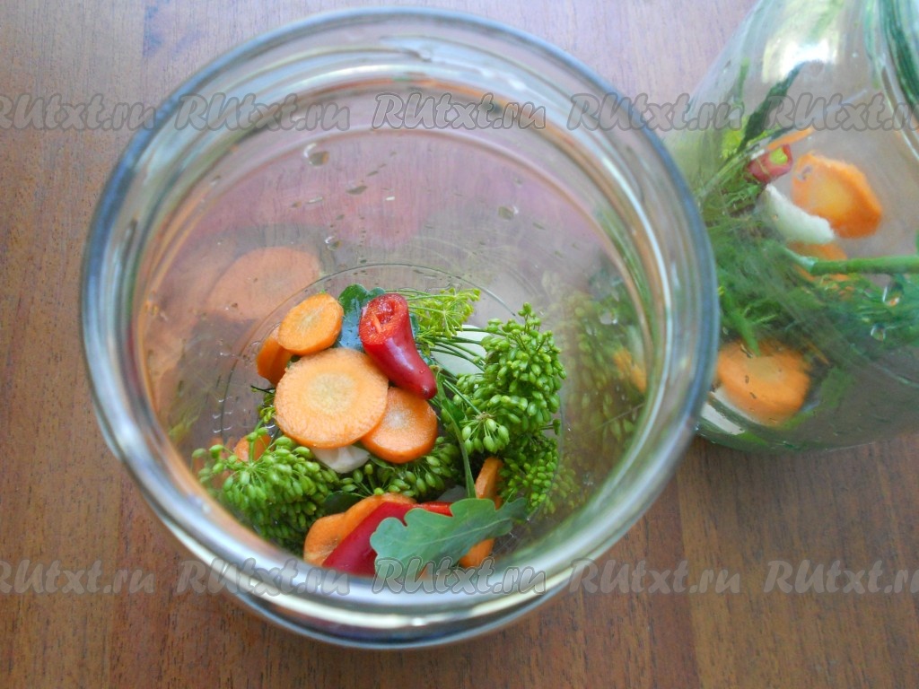Огурчики предварительно замочить на 3-4 часа в холодной воде. После этого тщательно их вымыть. Банки заполнить огурцами, перекладывая их кружочками моркови, сверху разместить по зонтику укропа.