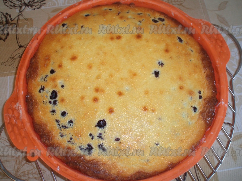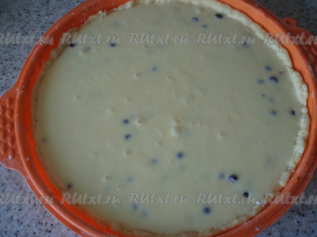 Сверху на чернику распределить сметенную заливку. Поставить форму с пирогом в духовку, прогретую до 180 градусов. Выпекать пирог примерно 40 минут. Заливка должна схватиться.