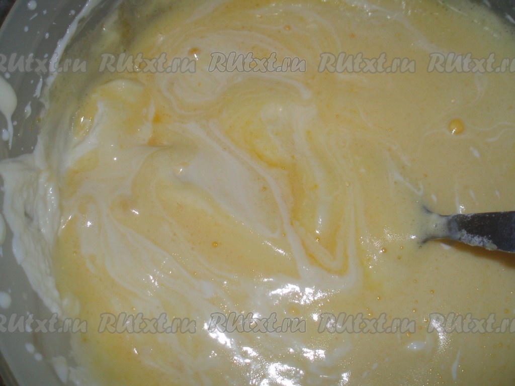 В смесь добавить просеянную муку, смешанную с разрыхлителем.