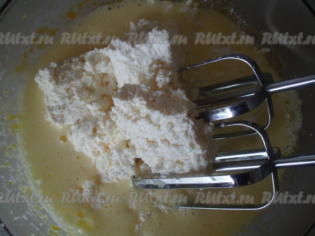 Затем добавить творог. Тесто получится более качественным, если творог будет сухим.