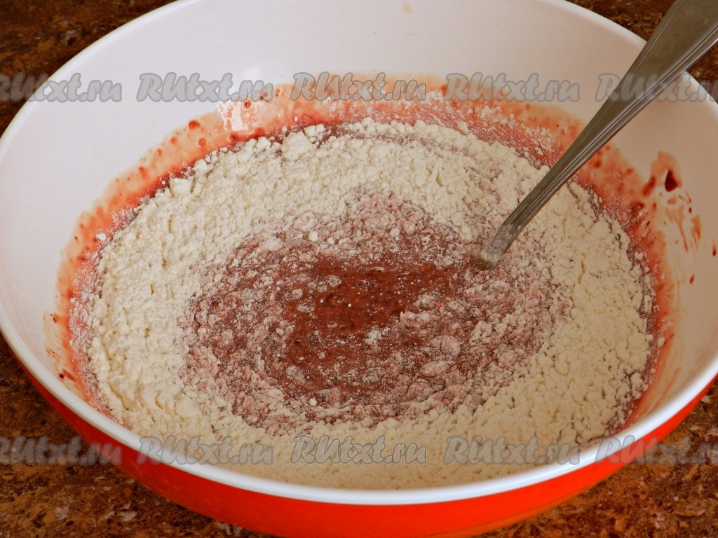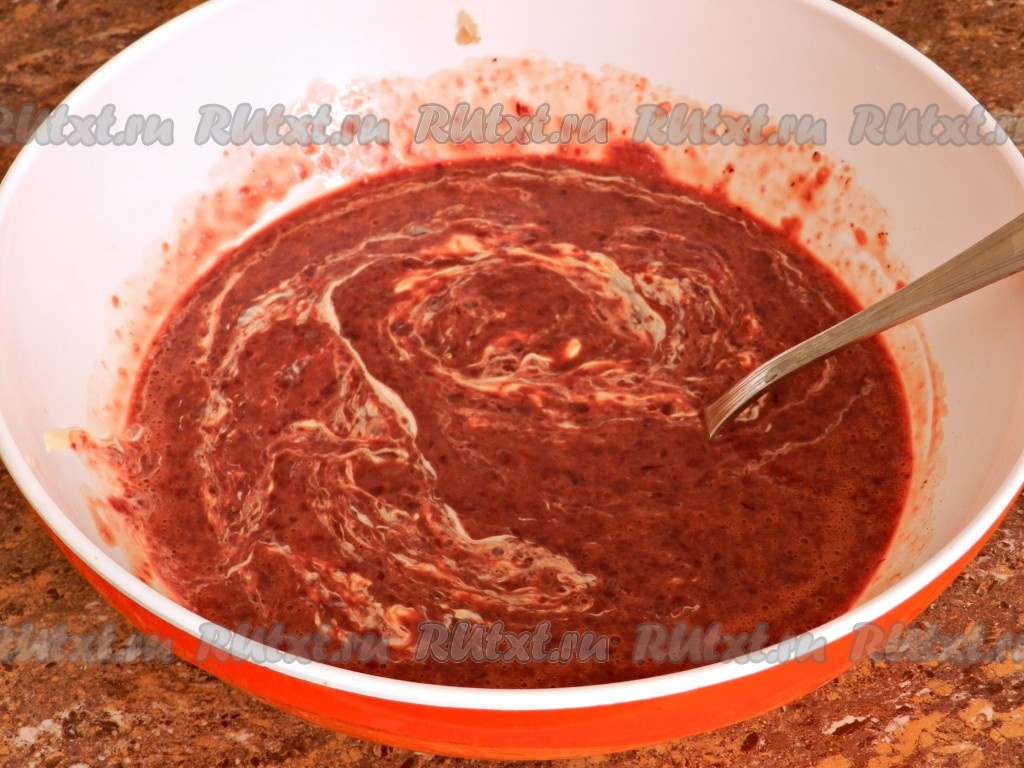 Постепенно всыпать муку. Муки может понадобиться больше или меньше, смотрите по консистенции - получившееся тесто должно стекать с ложки.