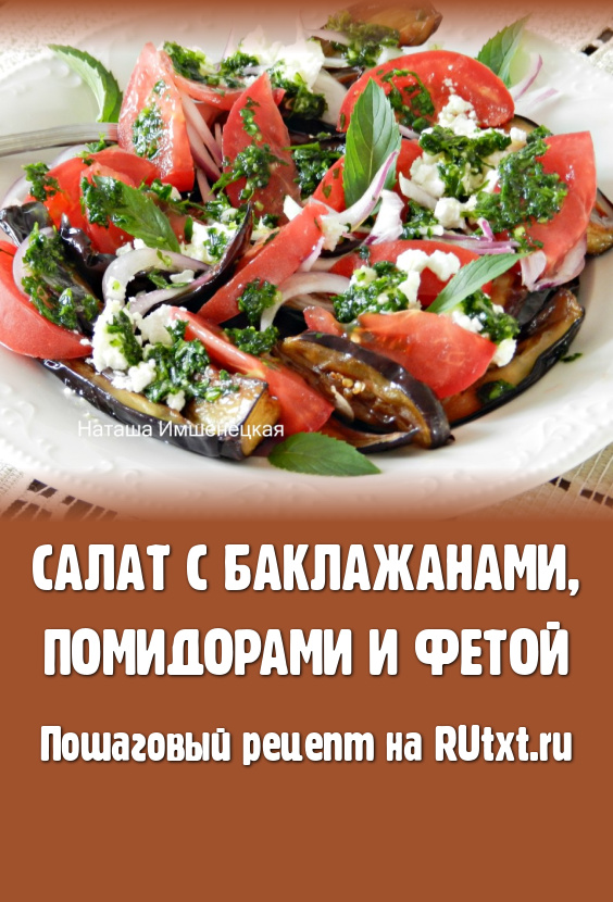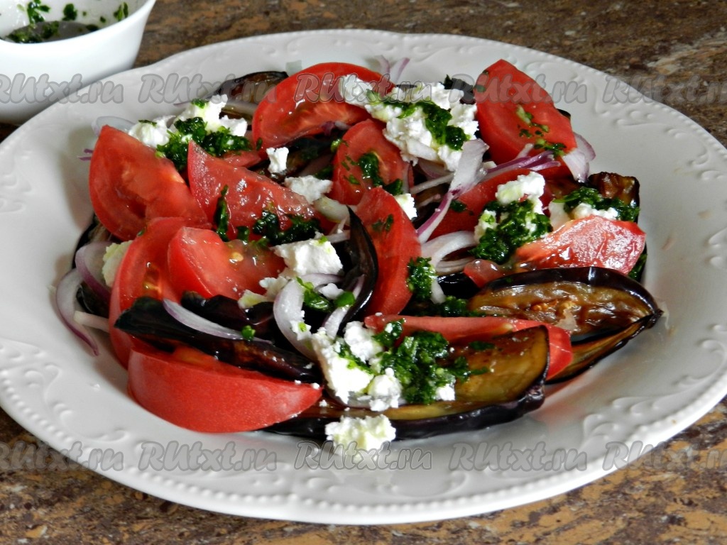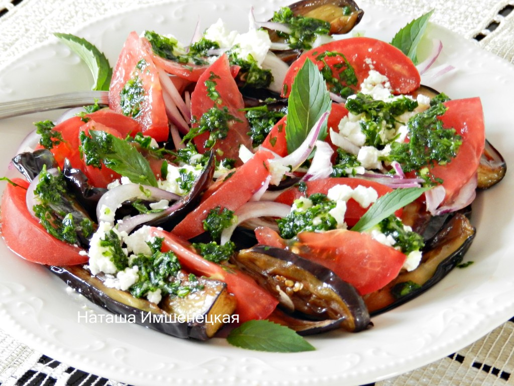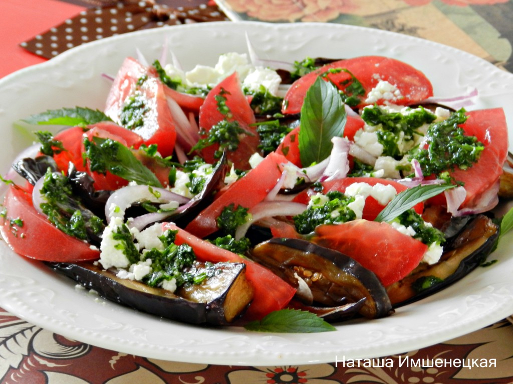 Аппетитный, сочный, вкусный салат с жареными баклажанами, свежими помидорами и фетой, по желанию, украсить свежей зеленью (я украсила листиками мяты) и сразу же подавать к столу.
