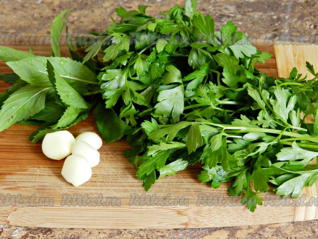 Зелень для этого салата можно взять любую, я обычно беру 1/3 пучка петрушки и 1-2 веточки мяты. Зелень вымыть, обсушить.