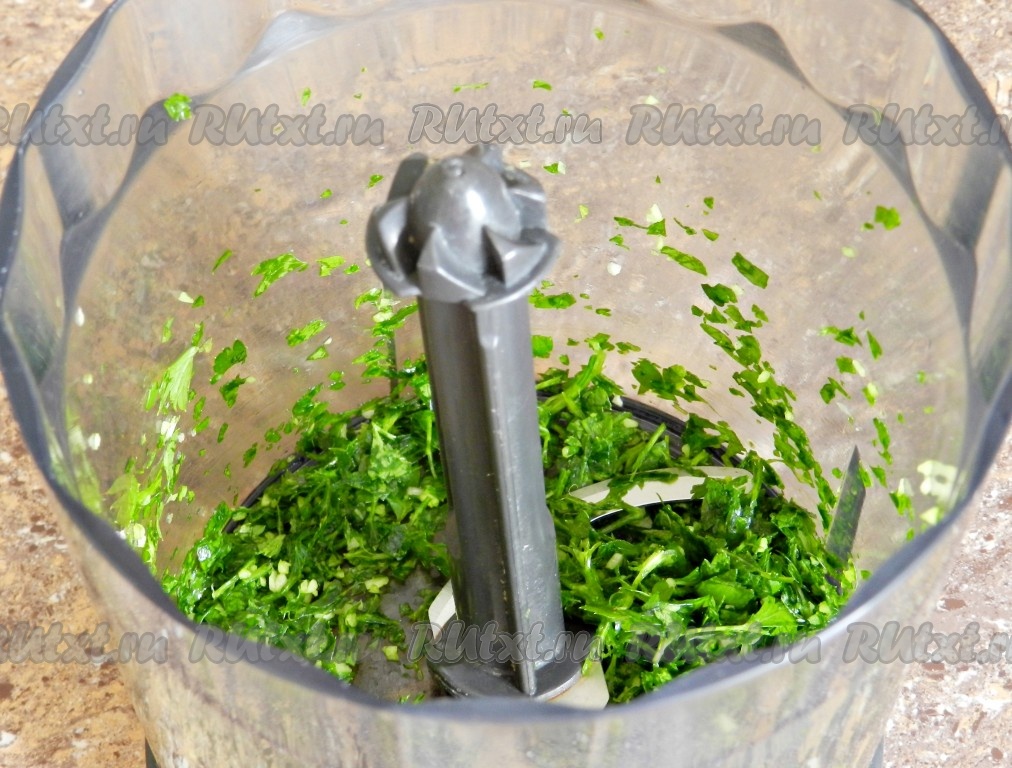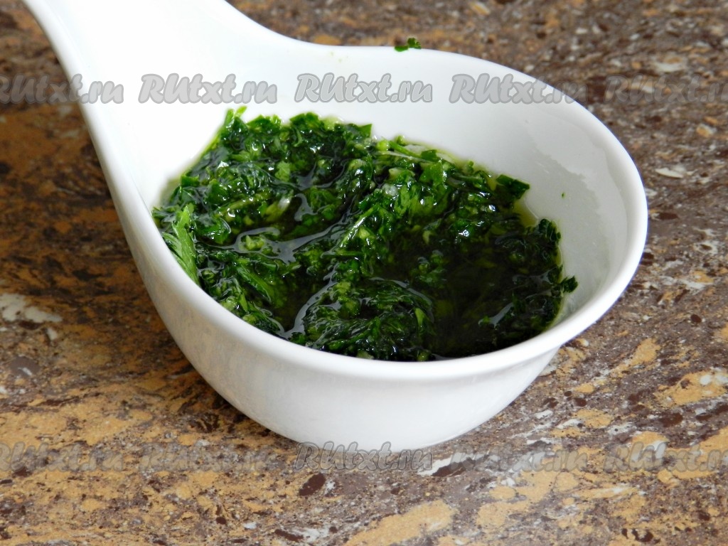 Сложить в блендер свежую зелень и чеснок, измельчить. Если нет блендера, можно зелень мелко нарезать и смешать с пропущенным через пресс чесноком. Затем влить оливковое (или другое растительное) масло, добавить соль и чёрный молотый перец, перемешать всё вместе в блендере (если готовите без блендера, тогда просто перемешайте ложкой).