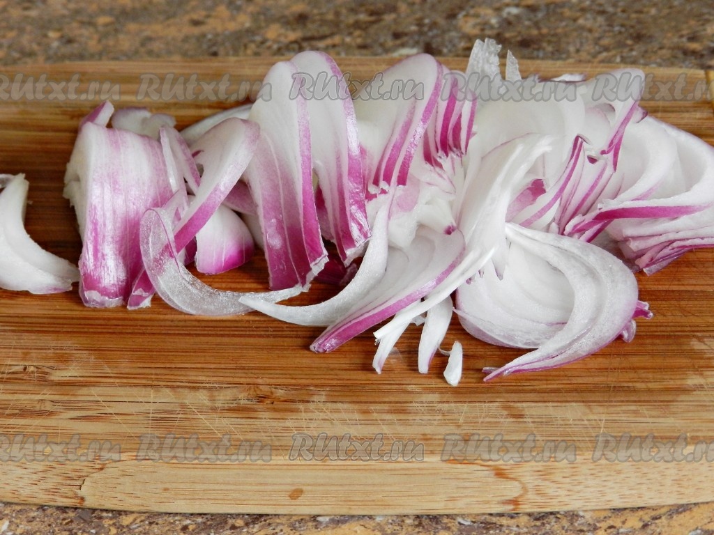 Лук нарезать на тонкие полукружочки (или четверть кружочки).