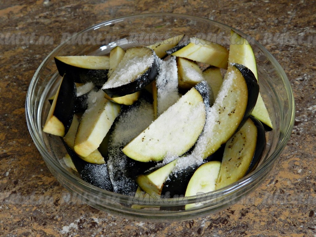 Баклажаны нарезать на кружочки (или полукружочки). Тонко нарезать баклажаны не нужно. Сложить нарезанные баклажаны в миску, посыпать солью, перемешать и оставить на 15-20 минут. Затем смыть соль под проточной водой, отжать с баклажанов лишнюю воду.
