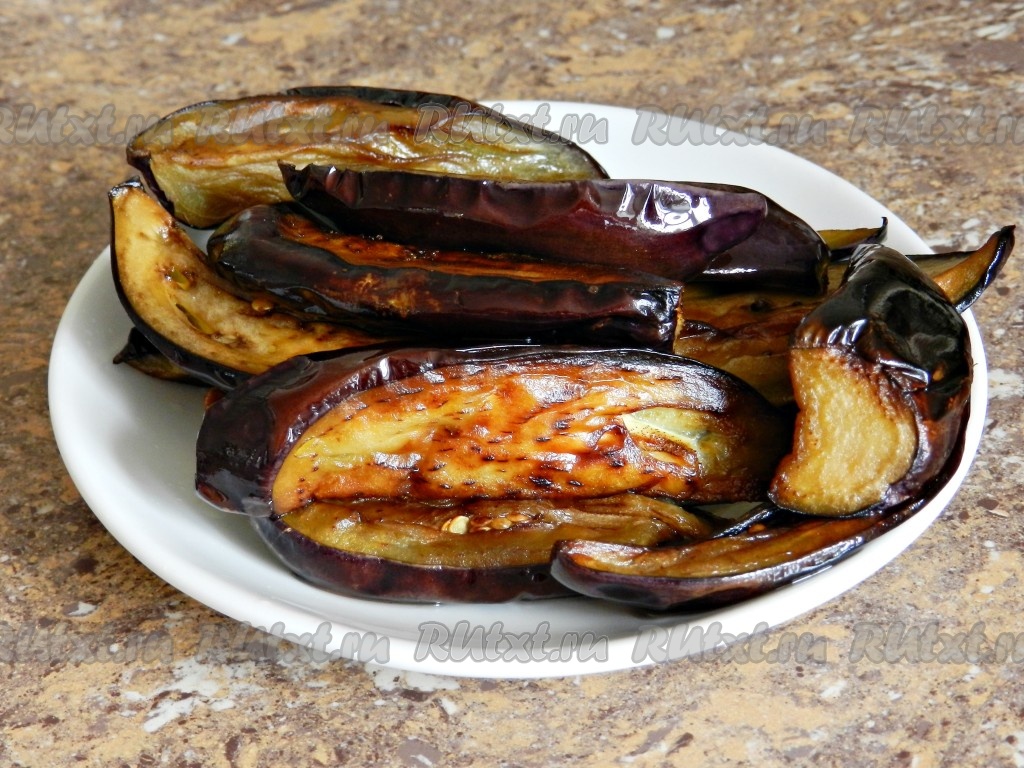 На сковороде разогреть растительное масло. Выкладывать баклажаны в один слой (все баклажаны сразу не поместятся в сковороду, поэтому жарить их нужно будет в несколько заходов) и обжаривать их на среднем огне с двух сторон до золотистой корочки. Жареные баклажаны со сковороды выкладывать на салфетку, чтобы стекло масло. Постепенно пожарить все баклажаны.
