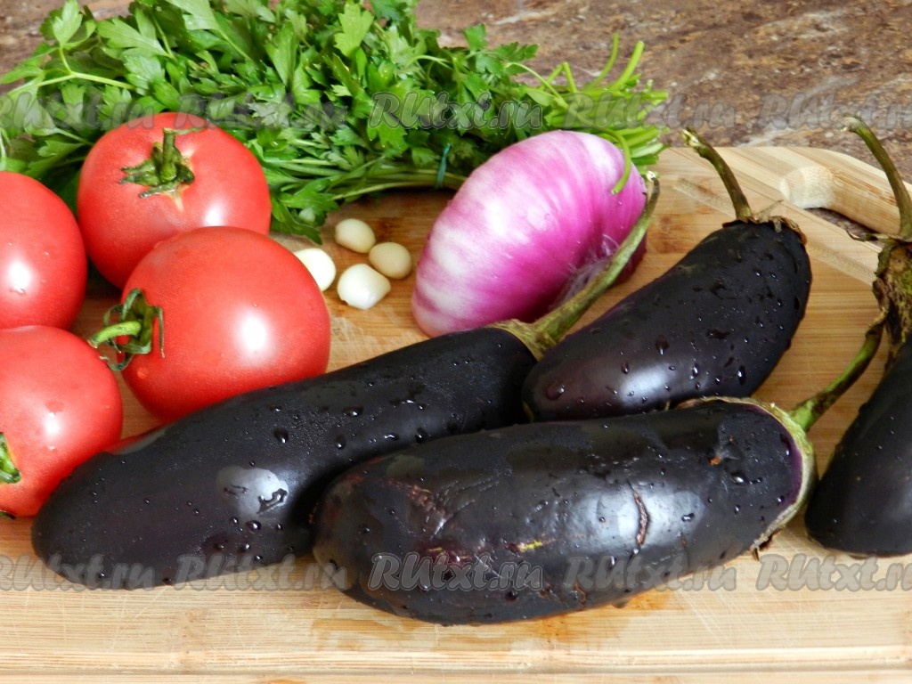 Баклажаны и помидоры вымыть. Лук и зубчики чеснока очистить.