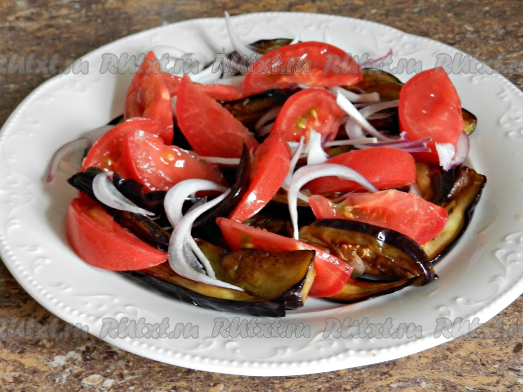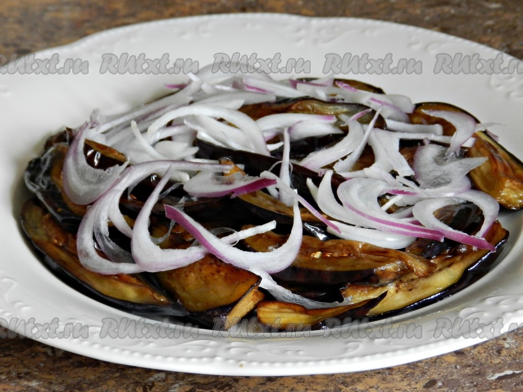Салат я подавала порционно, поэтому выкладывала его на 2 достаточно большие тарелки, равномерно распределяя овощи, сыр и зелень. Первым слоем выложить баклажаны, сверху - лук.