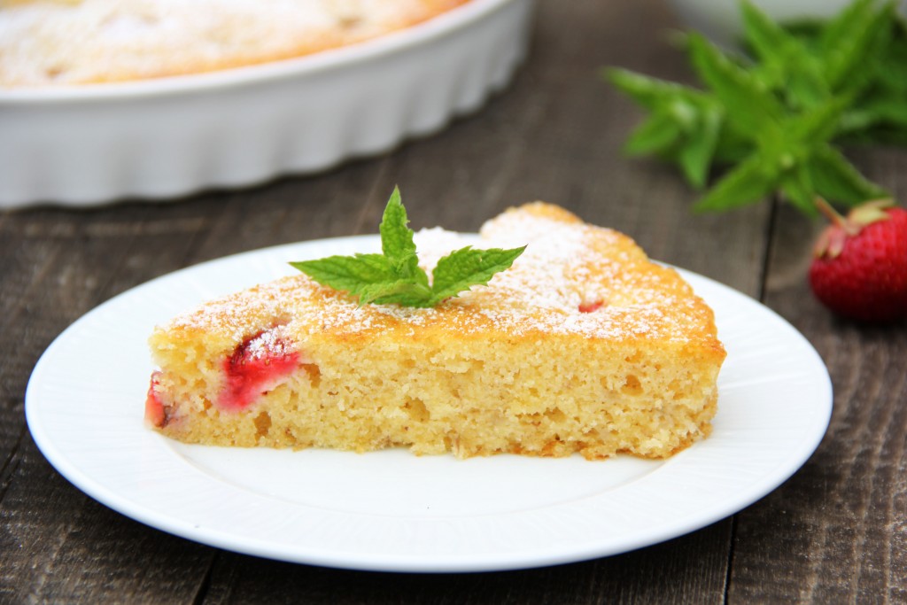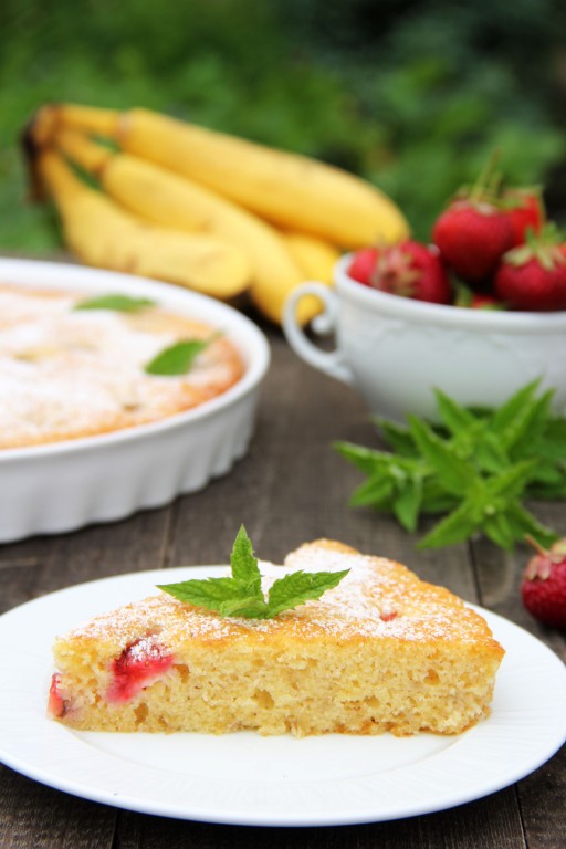 Готовый пирог слегка остудить, а затем разрезать на порции и подать к столу. Вот такой красивый и вкусный бананово-клубничный пирог получился.