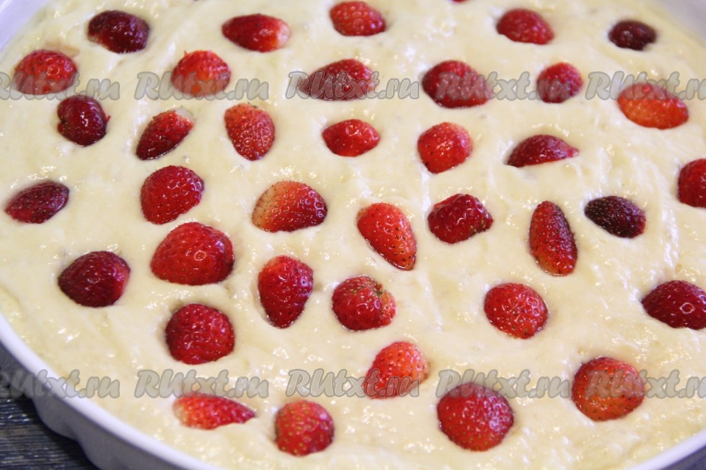 Клубнику вымыть, обсушить на бумажном полотенце. Выложить клубнику поверх теста.