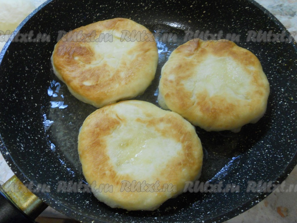 Каждый шарик приплюснуть рукой в лепёшку. Жарить пышки на разогретом растительном масле на небольшом огне до румяного цвета с двух сторон.