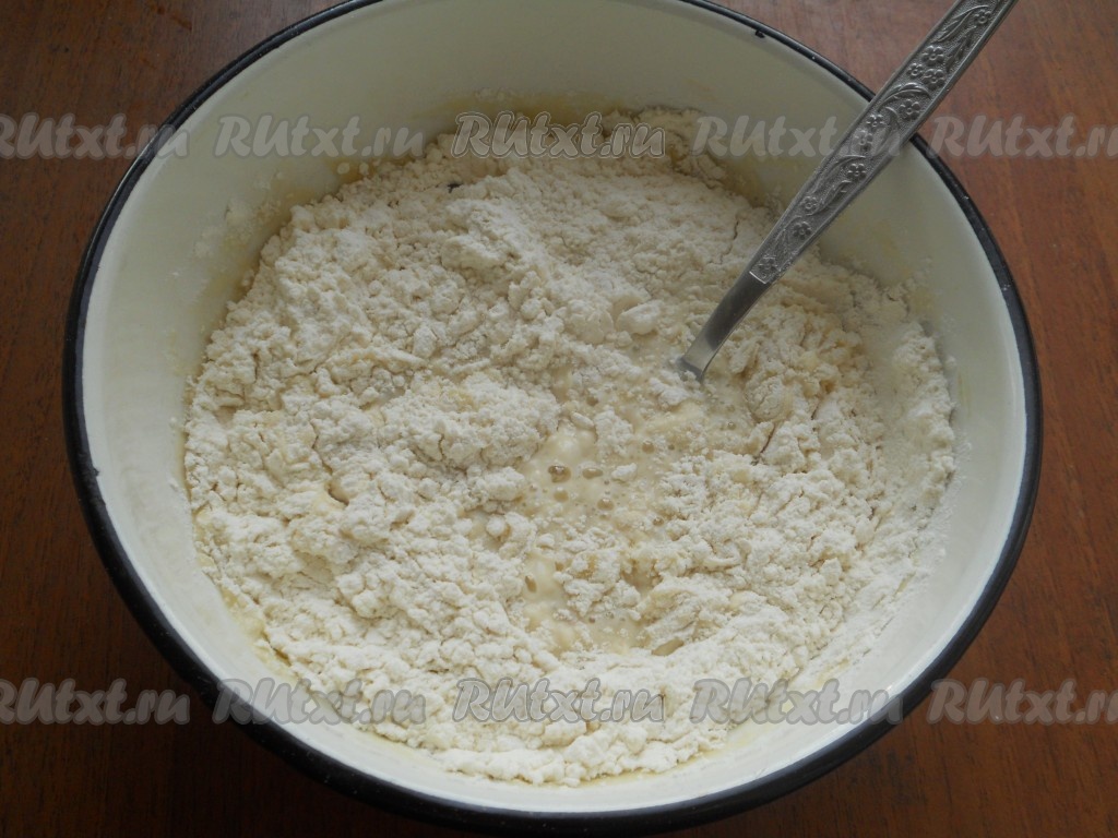 Частями всыпать в получившуюся массу просеянную муку, каждый раз тщательно вмешивая его. Как только тесто будет сложно перемешивать ложкой, начать вымешивать его руками.