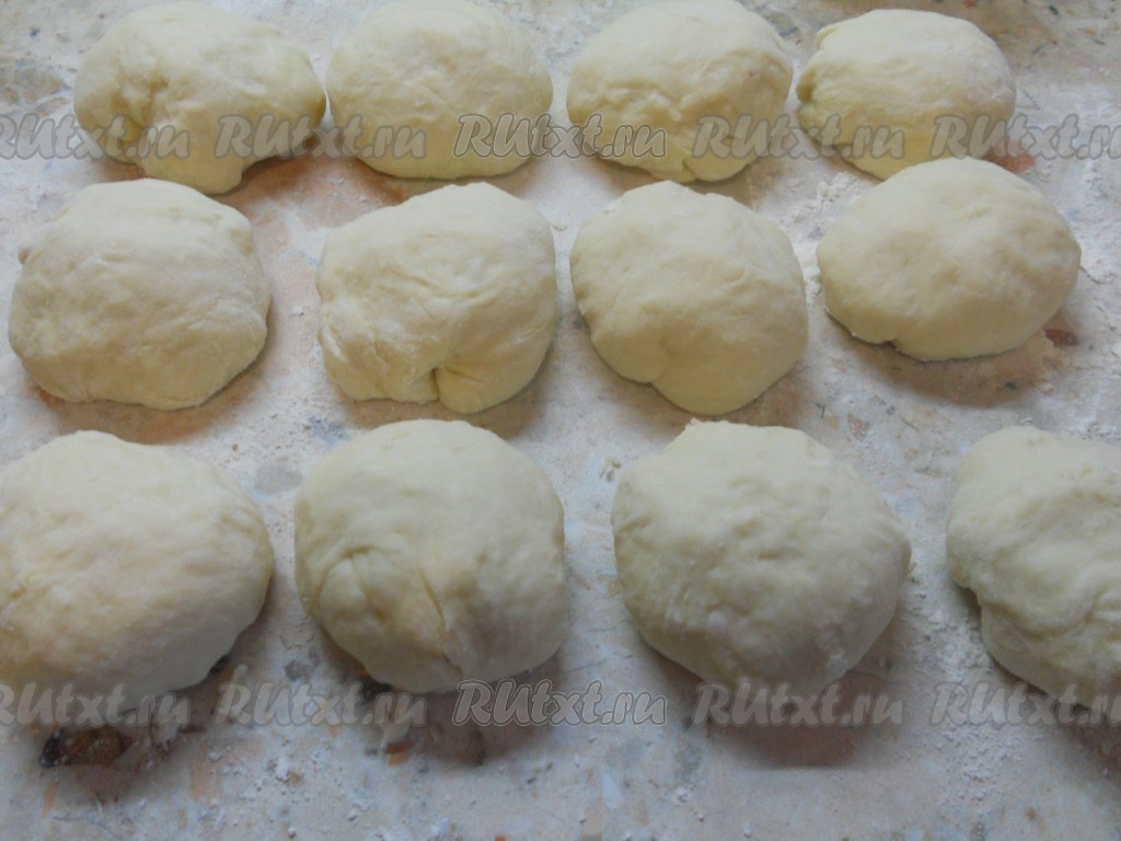 Готовое тесто обмять и разделить на 12 частей. Каждую часть скатать в шарик.