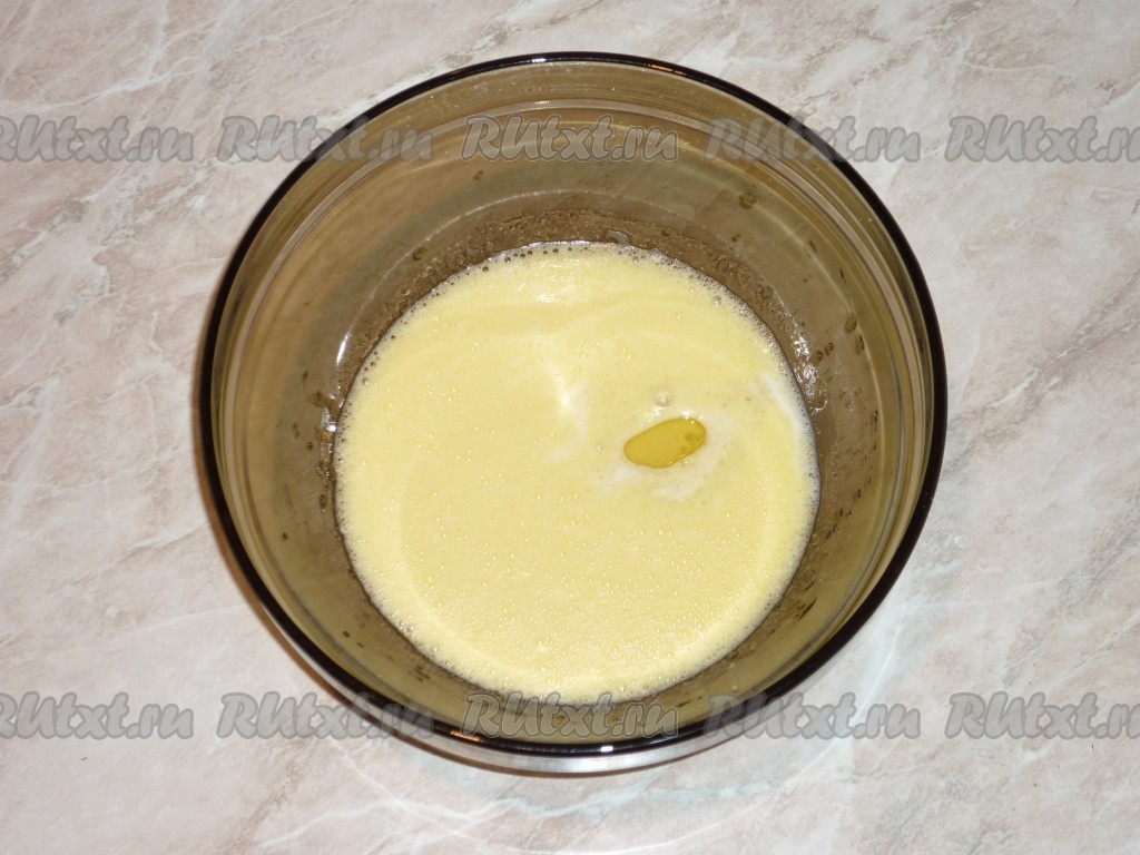 В яично-сахарную массу влить растительное масло и молоко, перемешать.