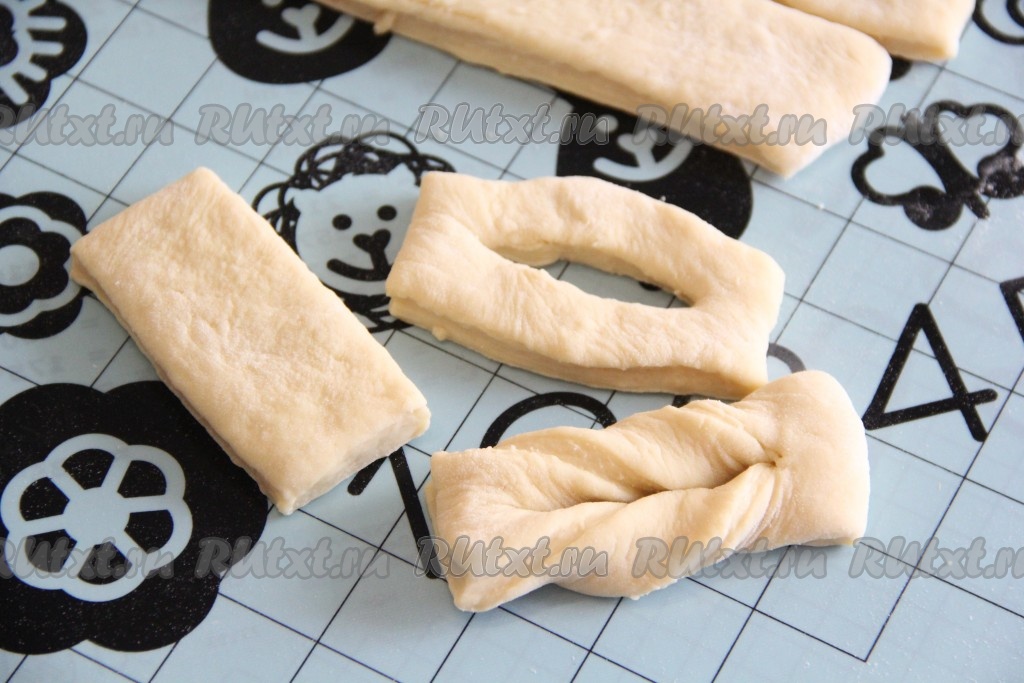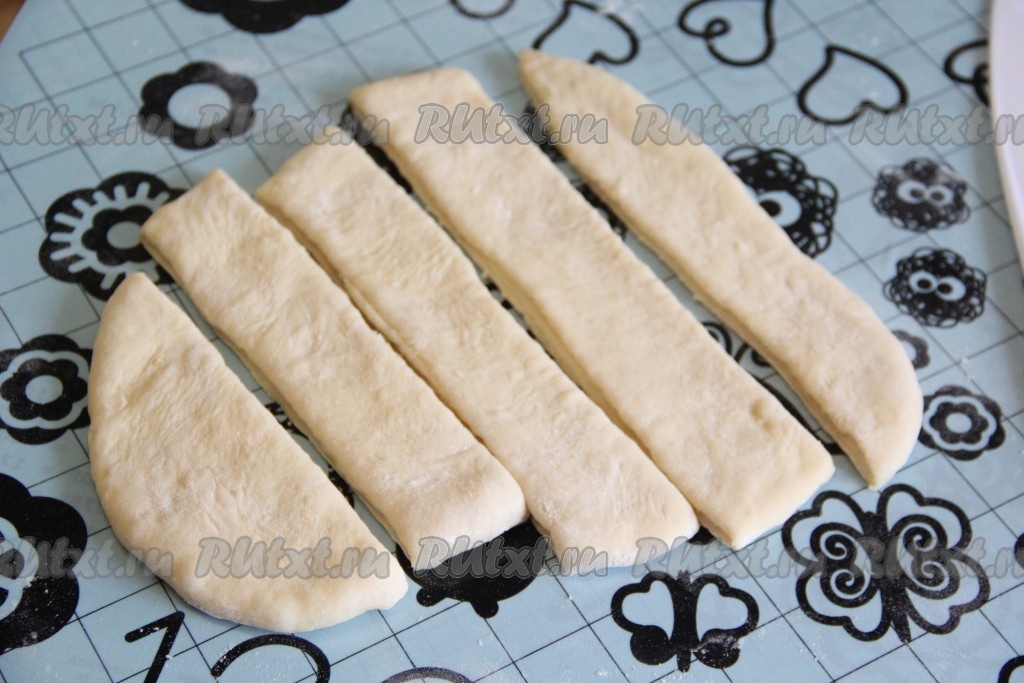 Затем на присыпанной мукой поверхности раскатать скалкой тесто в пласт толщиной примерно 1 сантиметр. Я разделила тесто на три части, а затем раскатывала каждую часть. Нарезать тесто на полоски шириной примерно 3 сантиметра.