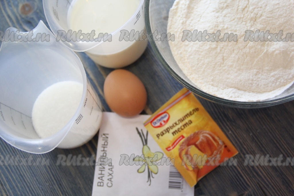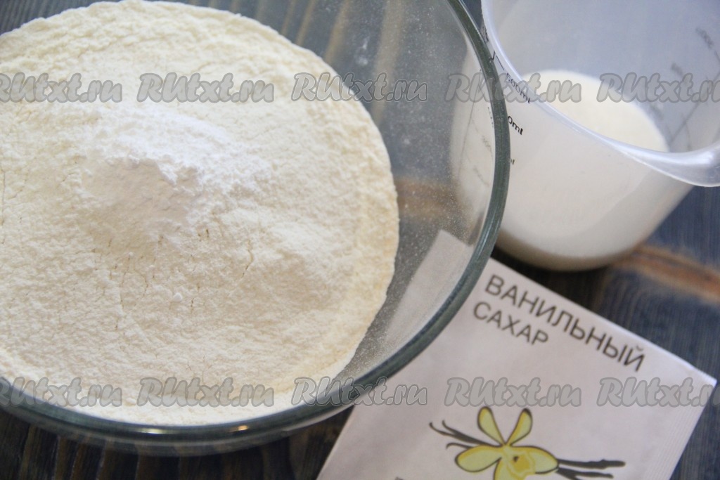 Подготовить продукты. Я заранее просеяла муку. Кефир можно взять любой жирности, я купила жирностью 2,5%.