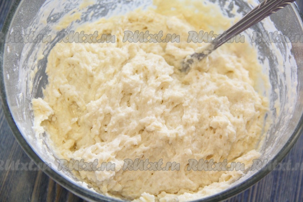Перемешать тесто ложкой, оно получится вязким и липким. Частями добавляя оставшуюся муку по мере необходимости, хорошо вымесить тесто руками.