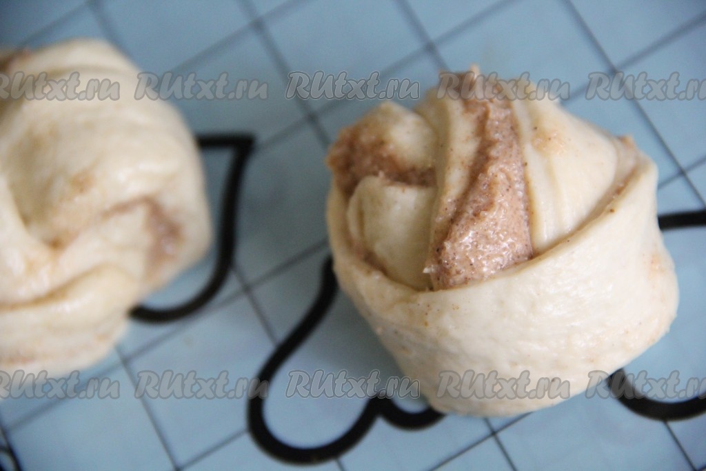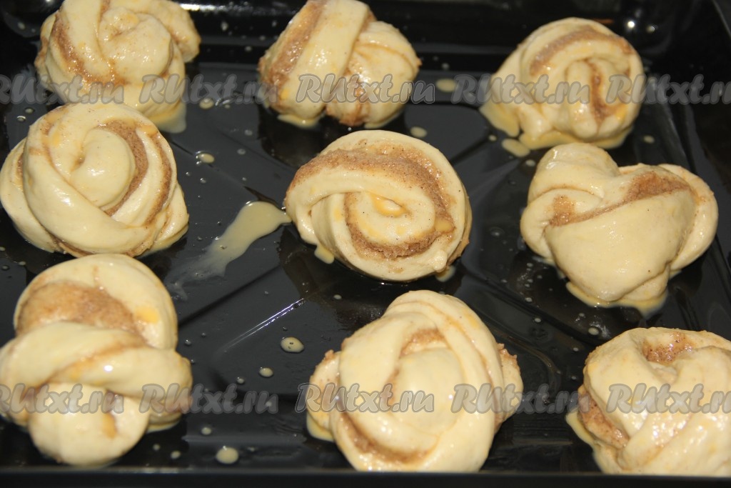 Подошедшие дрожжевые булочки с корицей и сахаром смазать взбитым ячным желтком и поставить в духовку, разогретую до 200 градусов, примерно на 25-30 минут.
