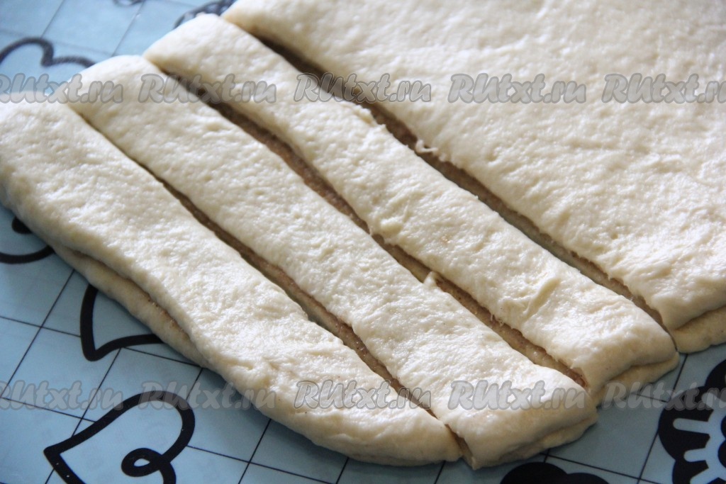 Нарезать тесто на полоски шириной примерно 1,5 см.