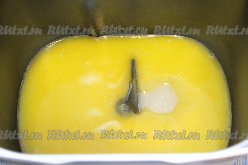 Влить в ведёрко хлебопечки молоко и сливочное масло, всыпать сахар.