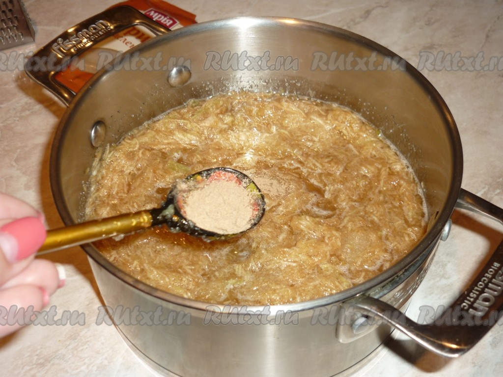 По истечении времени переложить яблочную массу в кастрюлю, в которой будем варить, добавить корицу и перемешать.