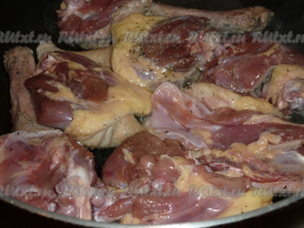 Гуся разрезать на порционные кусочки, обмыть холодной водой и обсушить. Мясо посолить и поперчить по вкусу, оставить на 20-25 минут.