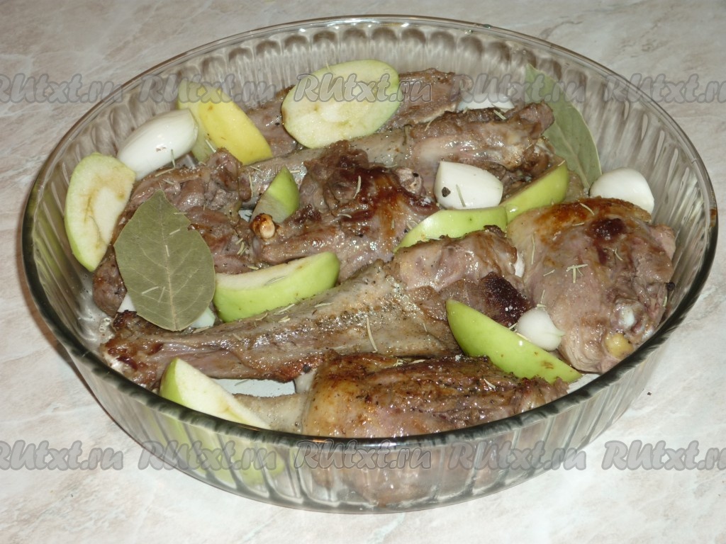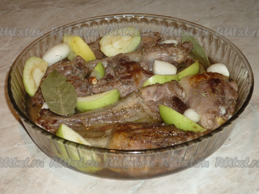 Отправить форму с кусочками гуся в духовку, разогретую до 180 градусов, на 1,5-2 часа. Время запекания зависит от возраста птицы.