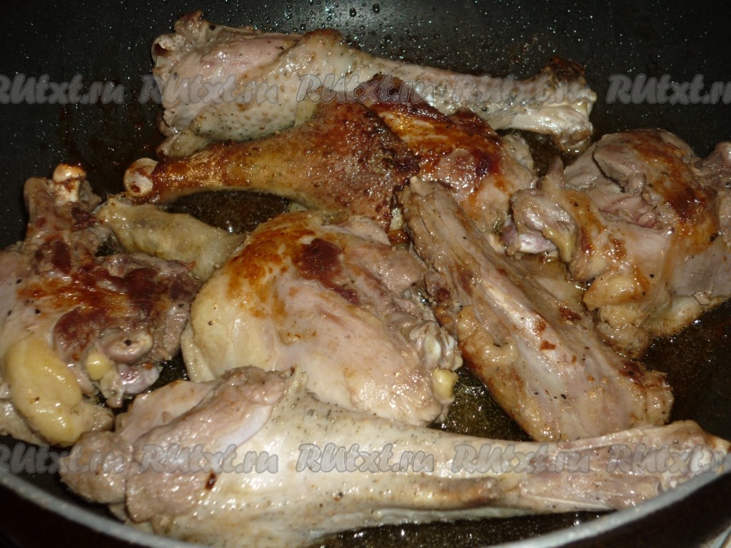 Кусочки гуся выложить на сковороду с хорошо разогретым растительным маслом.