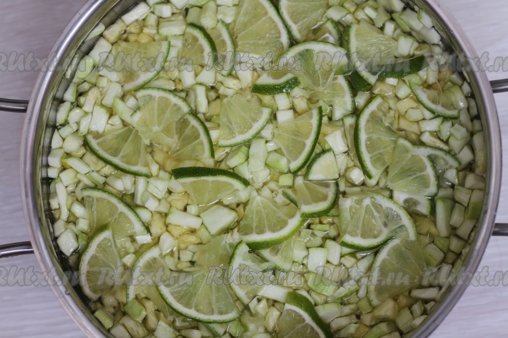 Все подготовленные продукты выкладываем в посуду, в которой будем варить варенье. Добавляем нарезанный лайм (или лимон).