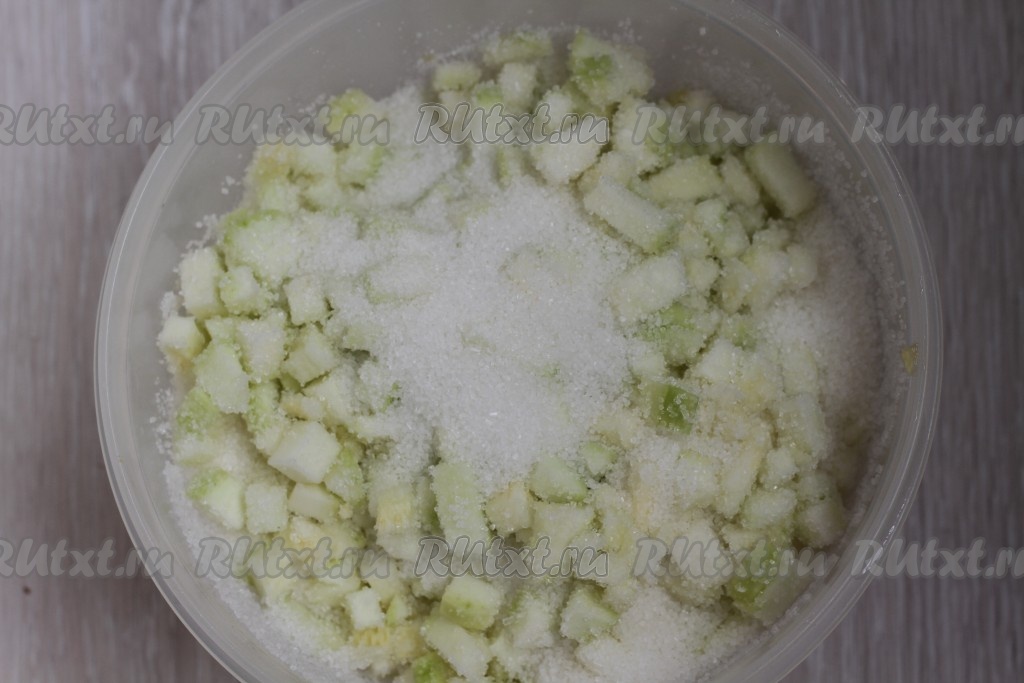 Засыпаем кабачки оставшимся сахаром и оставляем на 30 минут, чтобы кабачки пустили сок.