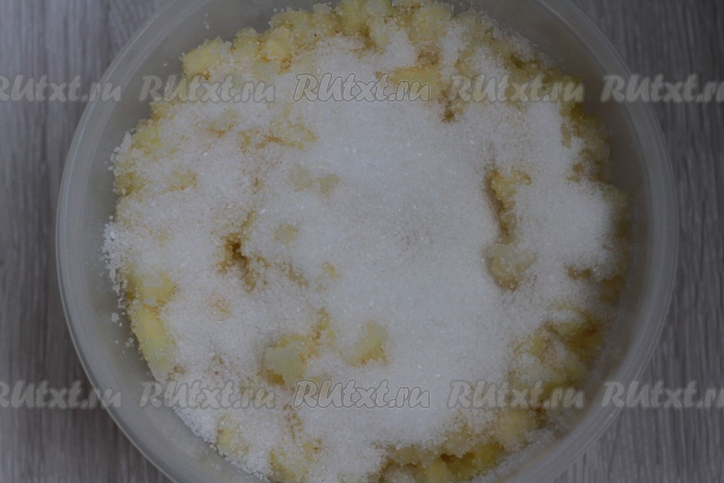 Засыпаем ананас 500 граммами сахара, перемешиваем ложкой и оставляем на три часа.