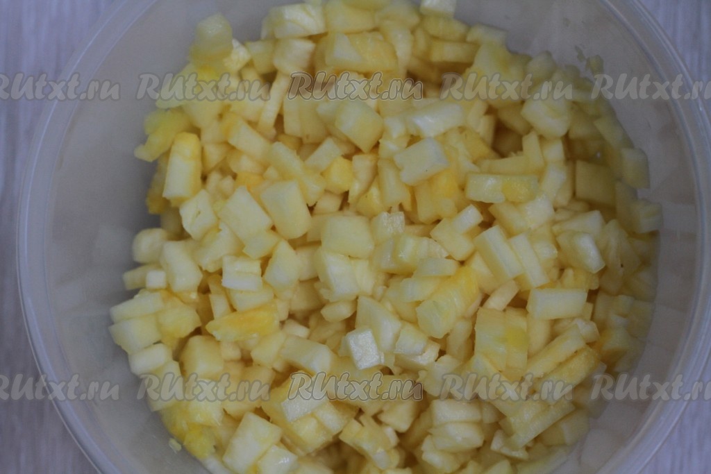 Прежде всего ананас нужно очистить. Ножом срезаем нижнюю и верхнюю части ананаса, затем снимаем кожицу, нарезаем на круглые дольки и из каждой дольки ананаса удаляем жесткую середину. Очищенный ананас нарезаем кусочками и складываем в емкость.