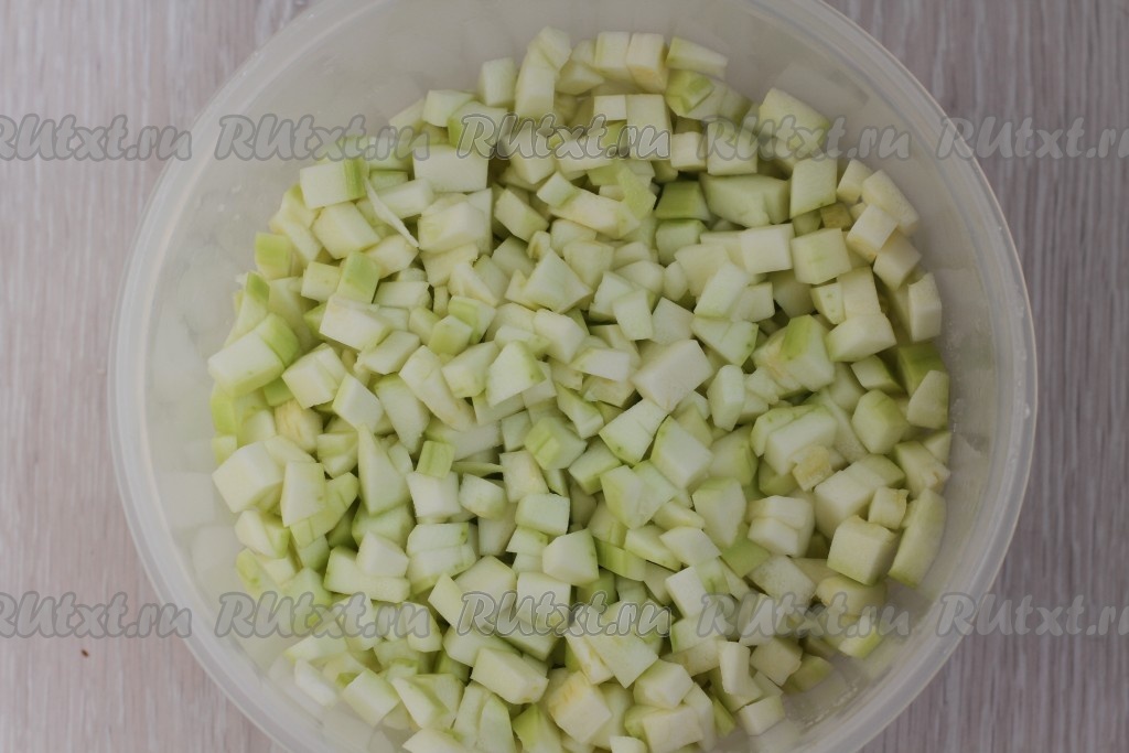 Кабачки тщательно моем, затем очищаем от кожуры. Если есть семена, то тоже их удаляем. Нарезаем очищенный кабачок небольшими кубиками так, как показано на фото.