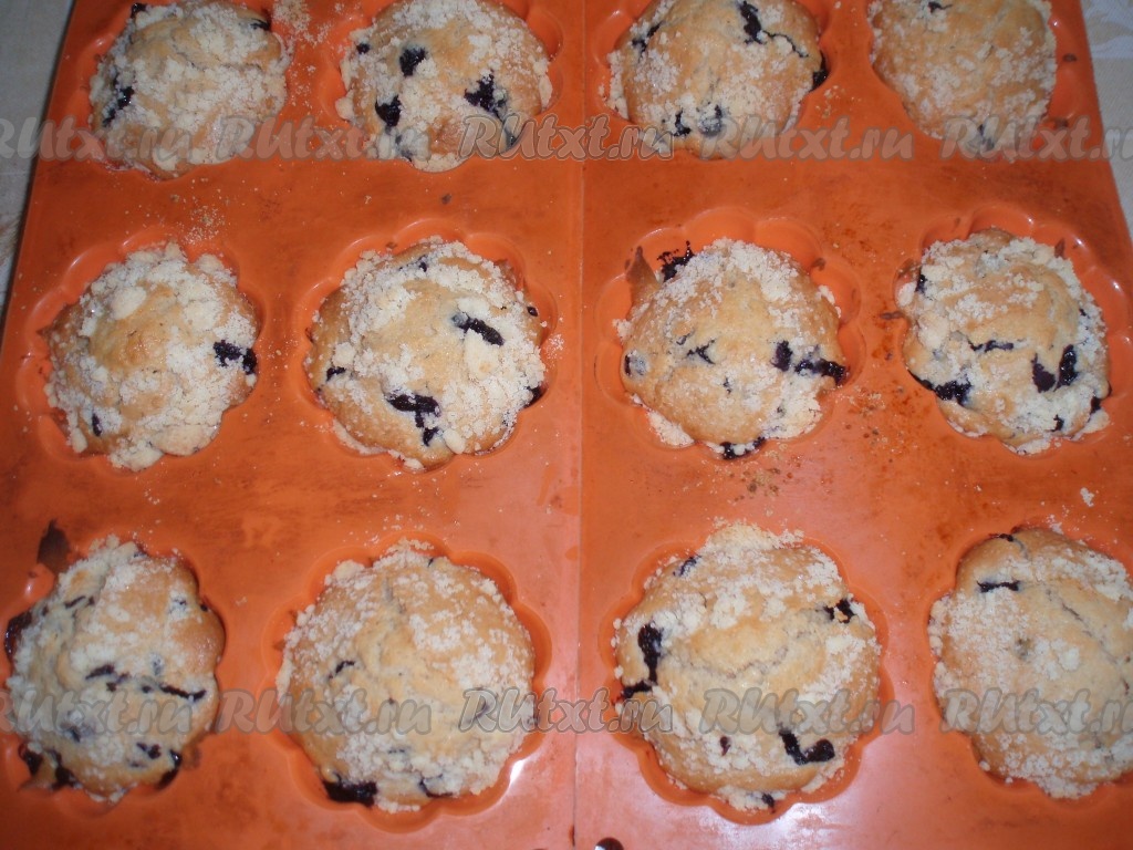 Приготовленное тесто выложить в силиконовые формочки для кексов, заполняя их на 2/3 объёма. Если будете использовать железные формочки, то обязательно смажьте их маслом. По желанию, будущие кексы с черникой перед выпечкой можно посыпать штрейзелем. Для приготовления штрейзеля нужно смешать муку, сахар и растопленное сливочное масло до образования крошки и посыпать тесто для кексов, выложенное в формочки.