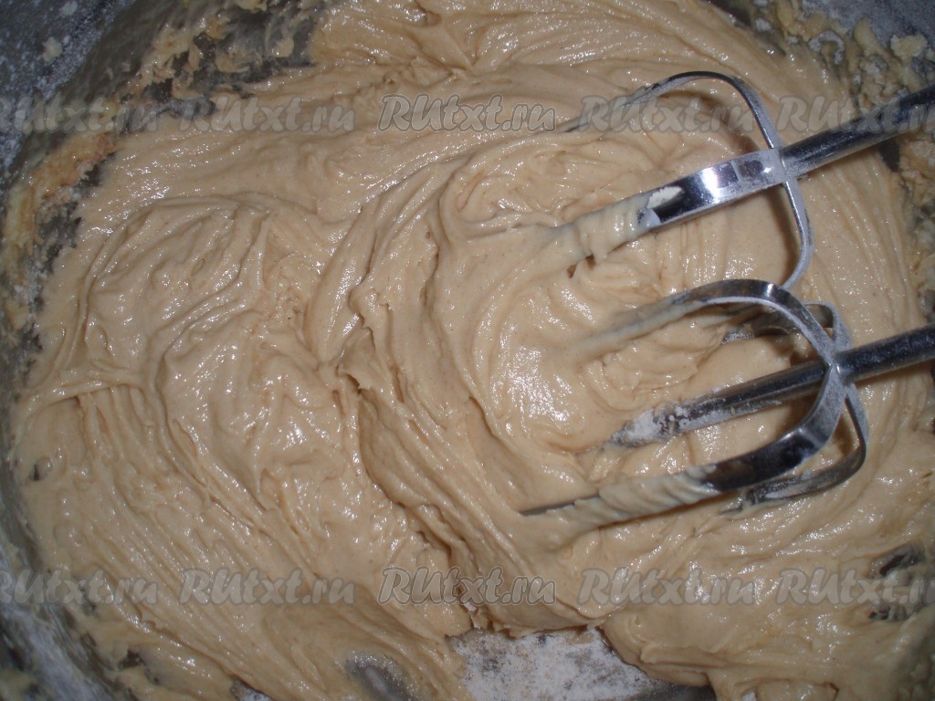 Добавить просеянные продукты к взбитой массе и перемешать до однородности. Тесто получится достаточно густым. Я перемешивала миксером, можно также воспользоваться венчиком или лопаткой.