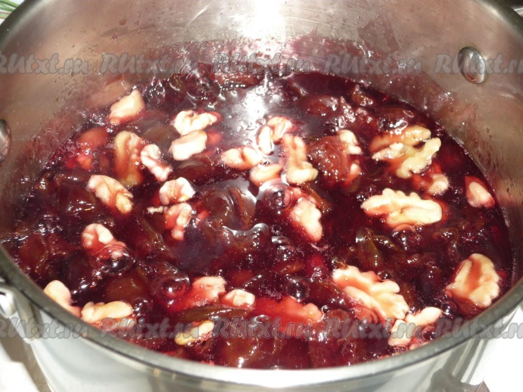 По истечении времени к сливам выложить подготовленные грецкие орехи и варить ещё 10 минут, иногда помешивая.