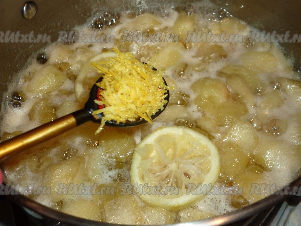 Лимон вымыть и снять с него цедру. В кастрюлю с яблоками выдавить сок лимона, влить воду и поставить кастрюлю на огонь.