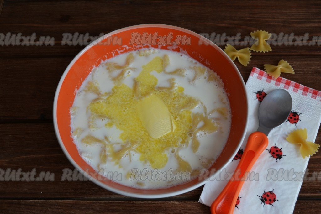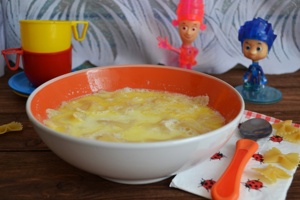 Разливаем молочный суп с макаронами по тарелкам, добавляем масло, разделенное на кусочки, и подаем теплым на стол.