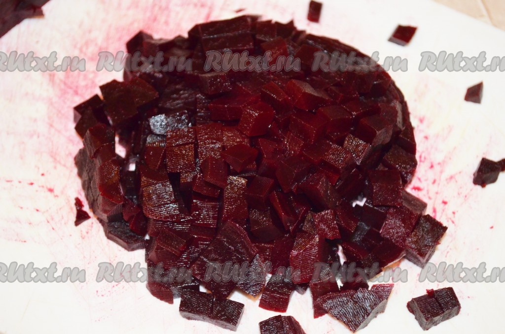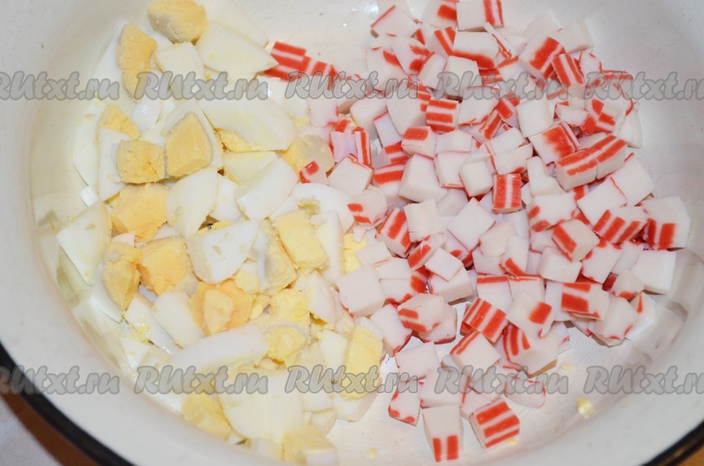 Свеклу вымыть, не очищая от кожуры, выложить в кастрюлю, залить полностью водой и отварить до готовности (в зависимости от сорта и размера свеклы на варку потребуется 50-70 минут, готовый корнеплод будет легко прокалываться ножом), затем полностью остудить и очистить. Яйца отварить в течение 10 минут с момента закипания воды, после этого остудить их полностью и очистить. Крабовые палочки разморозить, освободить от упаковки. Нарезать крабовые палочки и яйца на мелкие кубики, сложить в миску.
