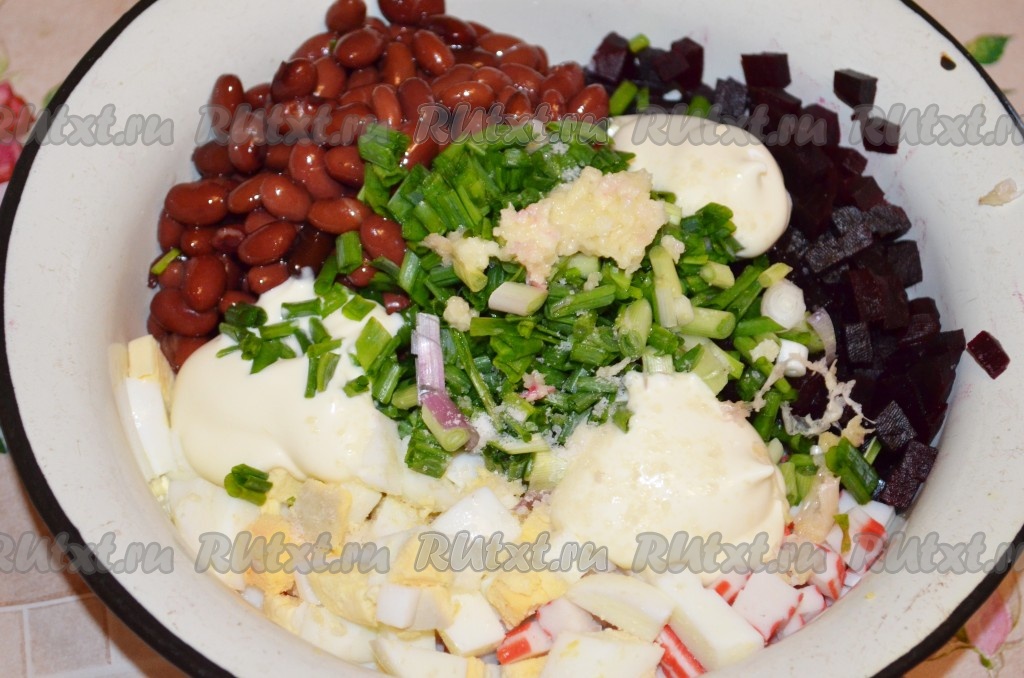 Чеснок очистить. Зелёный лук вымыть. С консервированной фасоли слить жидкость. В миску с яйцами и крабовыми палочками добавить свеклу, фасоль, мелко нарезанный лук, пропущенный через пресс чеснок, соль, чёрный молотый перец и майонез, хорошо перемешать салат.