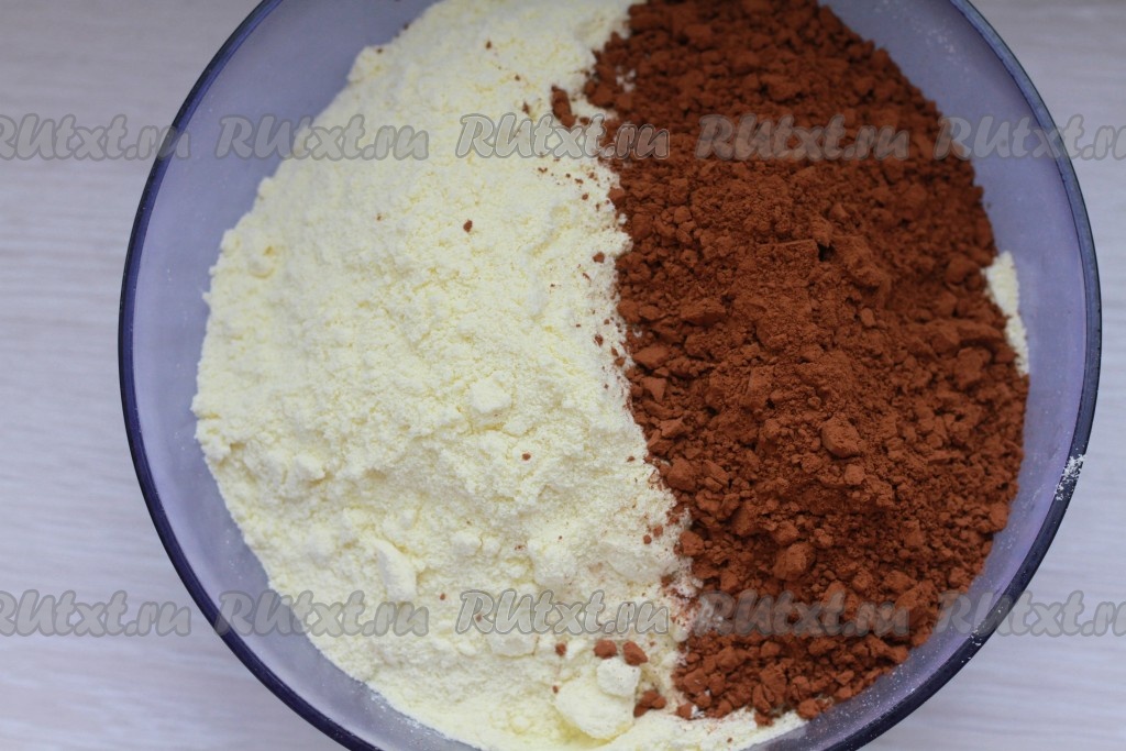 Соединить и хорошо перемешать сухую молочную смесь "Малютка" и какао в объёмной миске.