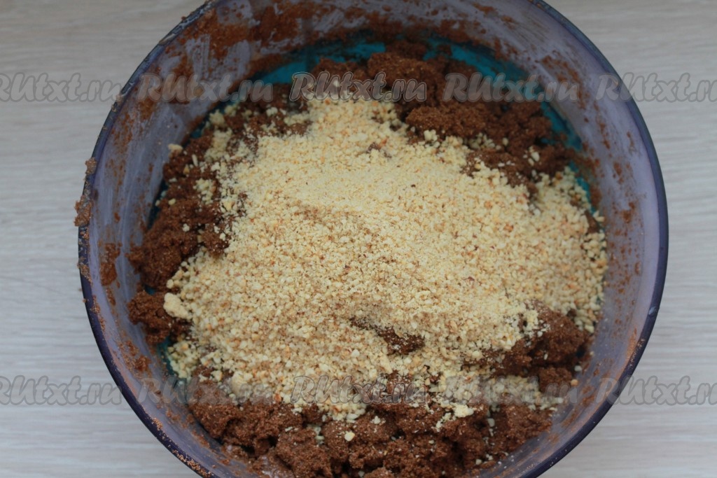 Остудить арахис, очистить и измельчить в блендере до получения крошки.