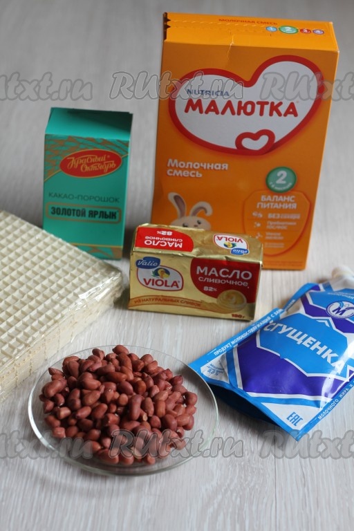 Подготовить все ингредиенты для приготовления трюфелей. При желании детскую смесь "Малютка" можно заменить на 4 стакана сухого молока и добавить сахар по вкусу.