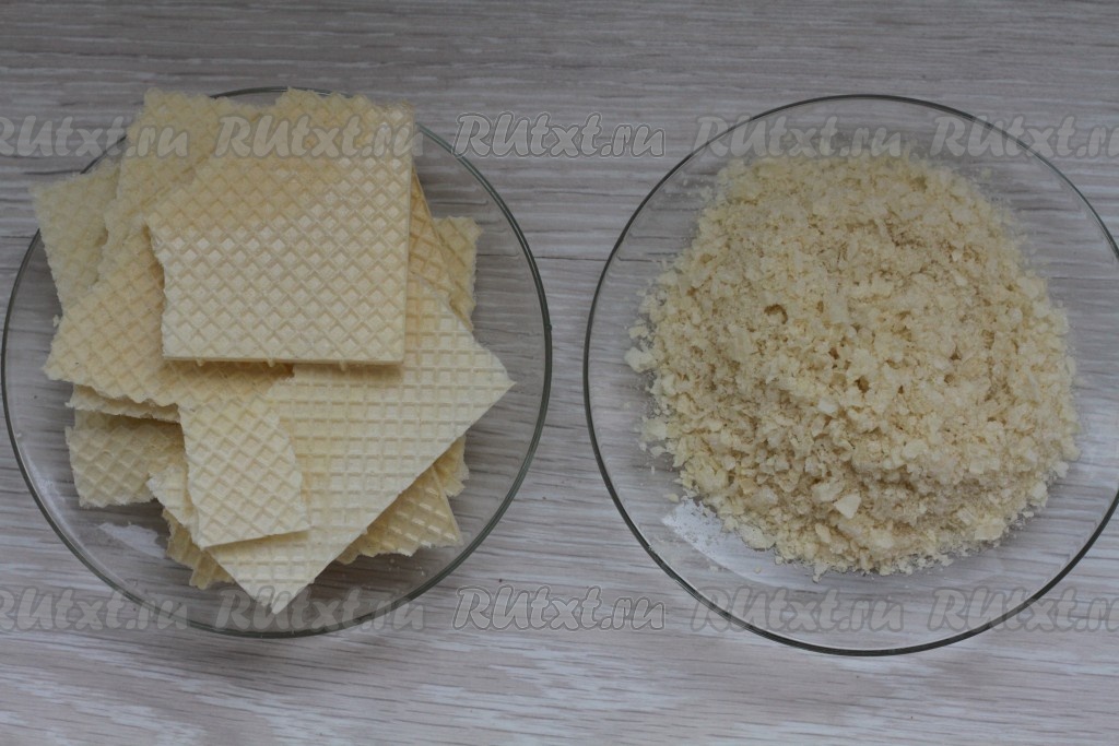 Подготовить вафли для украшения. Вафли также перемолоть в блендере в мелкую крошку.