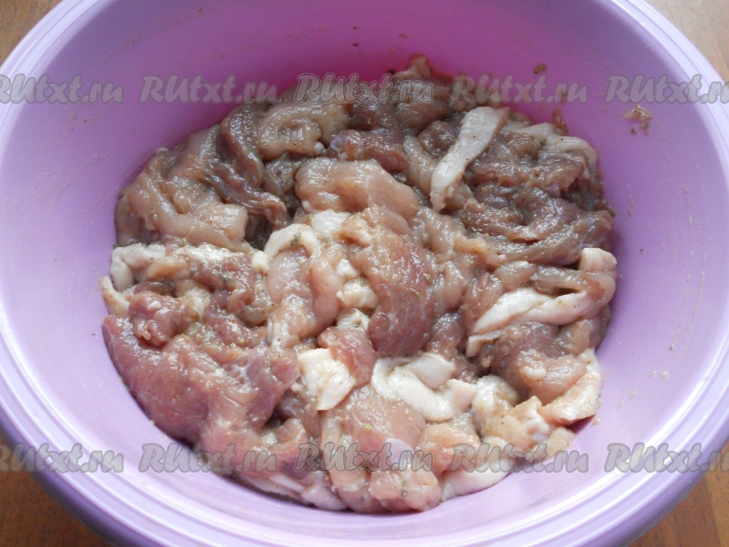 Таким же образом нарезать и подмороженное сало - пластинами чуть покороче. Добавить сало к мясу.