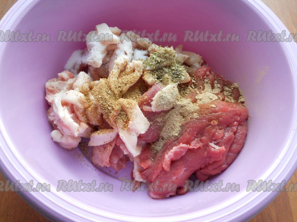 Добавить нитритную и обычную соль, кориандр, перец, майоран и сушеный чеснок. Нитритную соль можно приобрести только в Интернет-магазинах, она нужна для придания готовой колбасе колбасного вкуса и цвета. Эта соль в составе колбас повышает срок хранения готовой колбасы, а также не дает бактериям развиваться в сыром мясе. Нитритная соль совершенно безопасна для здоровья, так как нитрита натрия в составе соли содержится всего 0,5-0,6%, остальное - обычная поваренная соль. Все колбасы промышленного производства содержат в обязательном порядке данную нитритную соль.