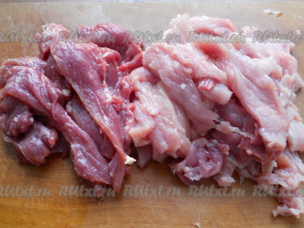 Свинину, говядину и сало подморозить. Свинину и говядину нарезать острым ножом на длинные пластины, как можно тоньше. Длина пластин около 10-12 см.