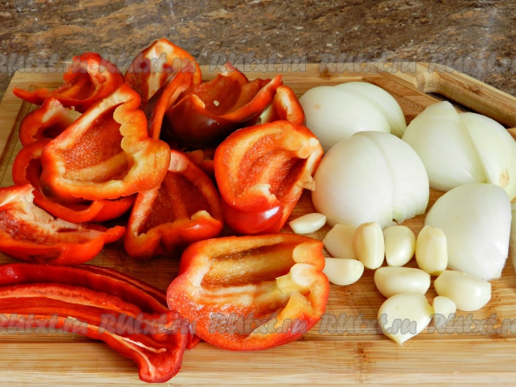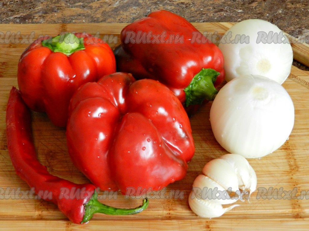Приготовить лук, болгарский и острый перцы, чеснок.